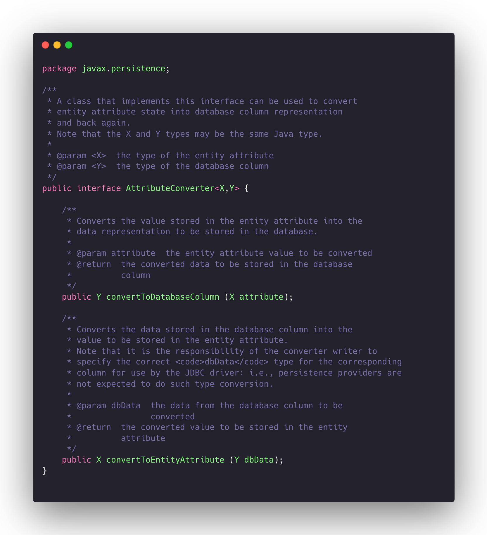 이 인터페이스를 구현하는 클래스를 사용하여 엔티티 속성 상태를 데이터베이스 열 표현으로 변환하고 다시 되돌릴 수 있습니다.