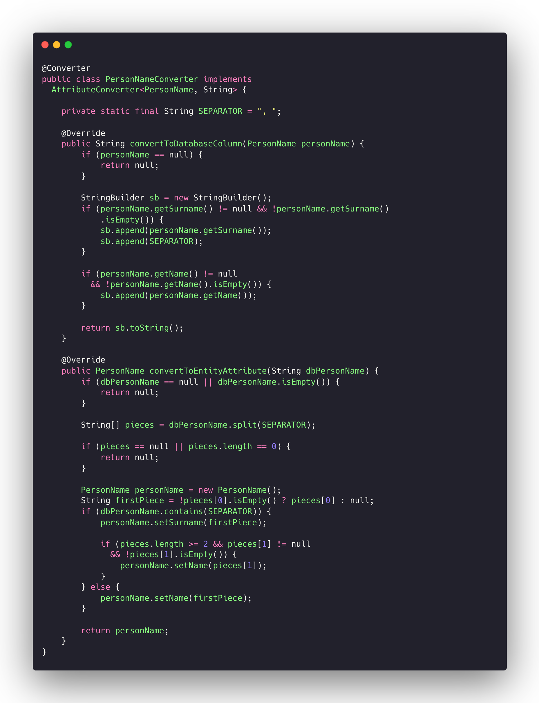 convertToDatabaseColumn 메소드 부분을 간단하게 살펴보자면 매개 변수로 PersonName을 받는다.