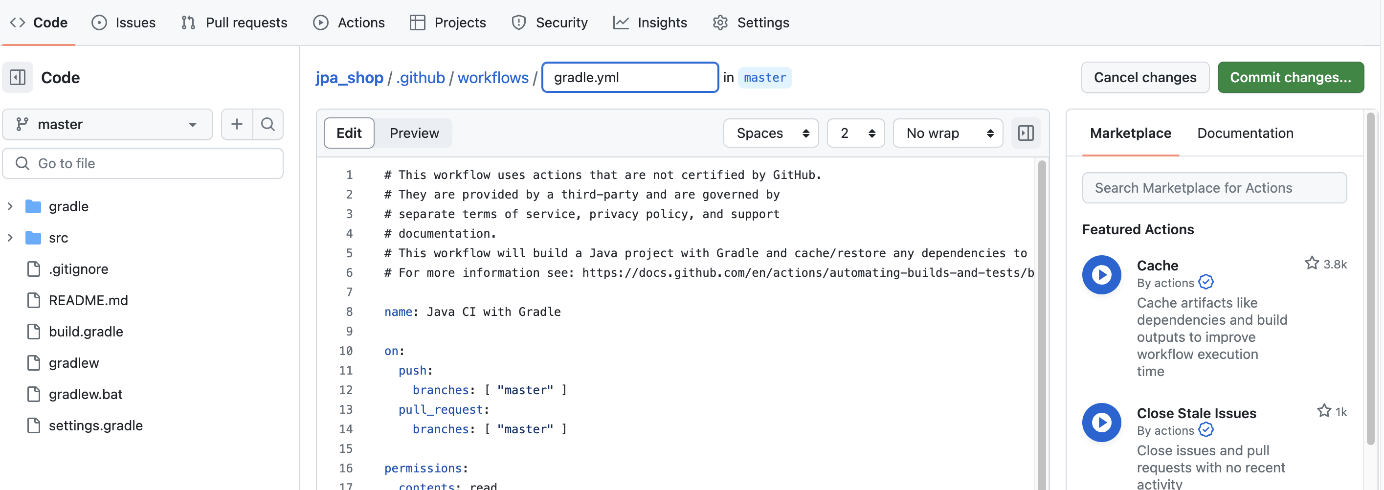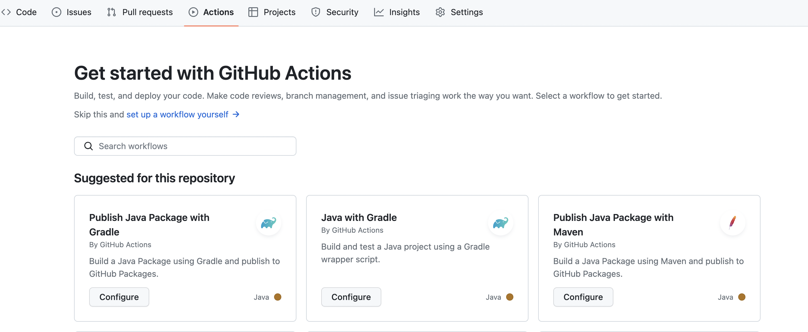 특정 Repository의 Actions 메뉴에 들어가면 기본적으로 내 플젝에 맞춰 추천해준 yml 파일 템플릿이 존재한다.